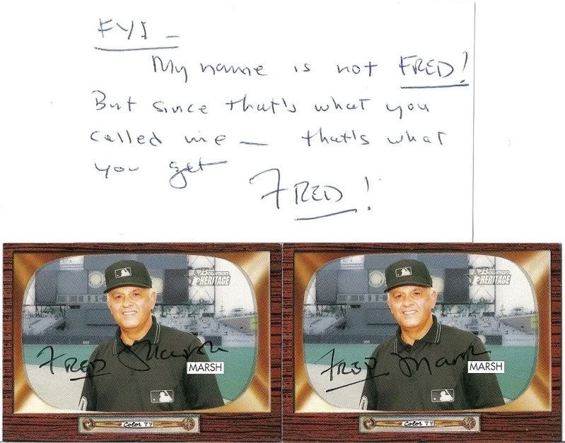 To my SCN brethren, hobbyist Barry Urbanek, I send a grateful standing O. Barry posted his misadventure with umpire Randy Marsh. Barry sent a 2004 Bowman card to Mr. Marsh, along with an envelope addressed to “Fred Marsh.”